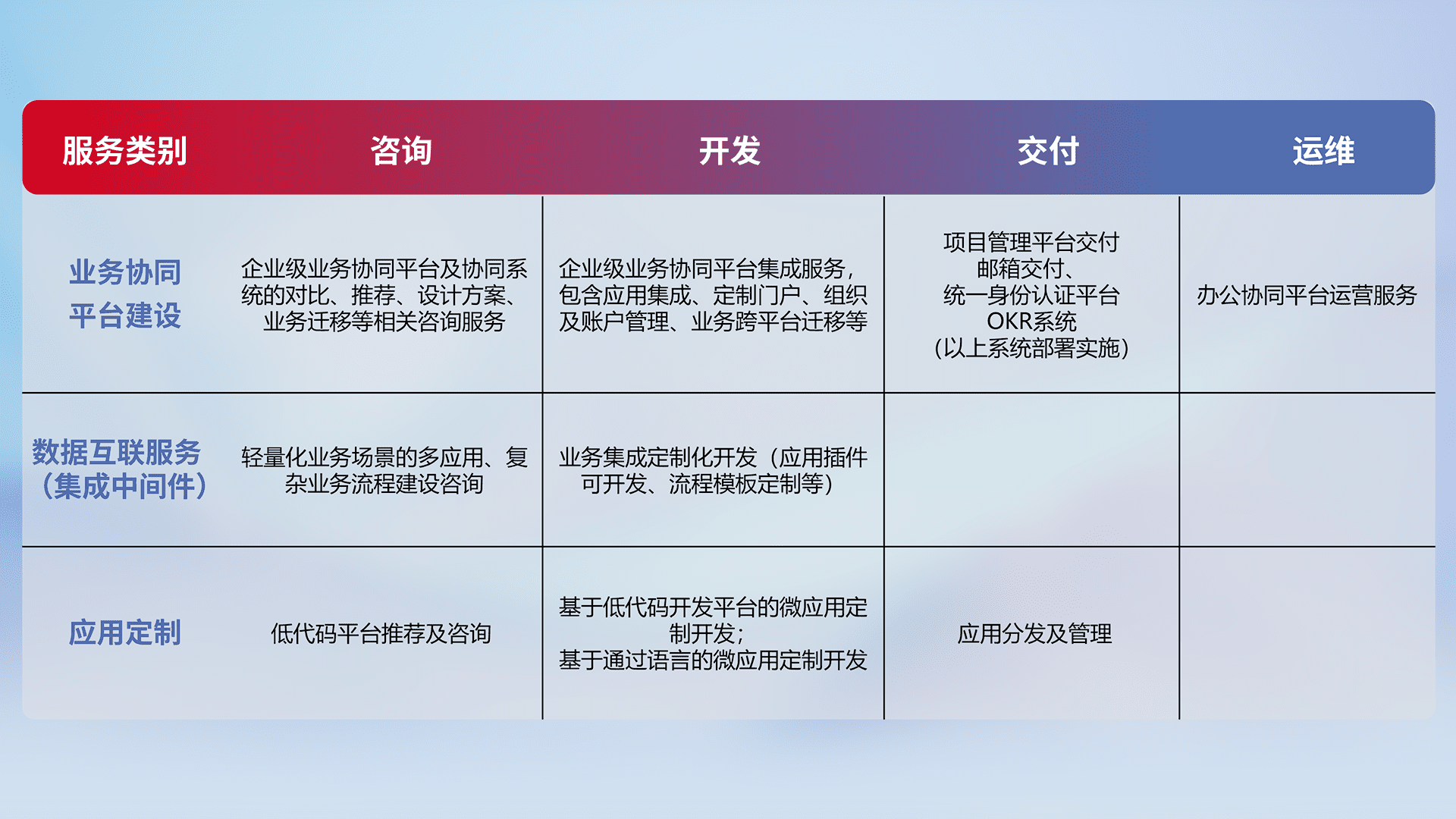 针对钉钉、、企微、、、、IDaas等平台级产品提供产品的规划、、、方案、、交付、、、、定制化开发等服务,,,,实现如统一协同办公、、智能客户服务、、、混合会议管理、、、智能数据查询、、等业务场景,,,,实现数字化转型。。。。